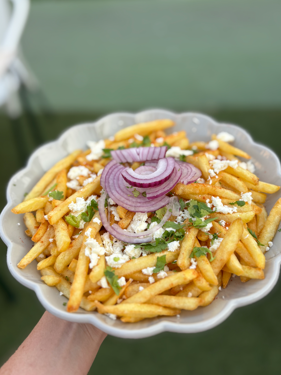 Fries seasoned with paprika, topped with crumbled Georgian cheese and crispy onion.