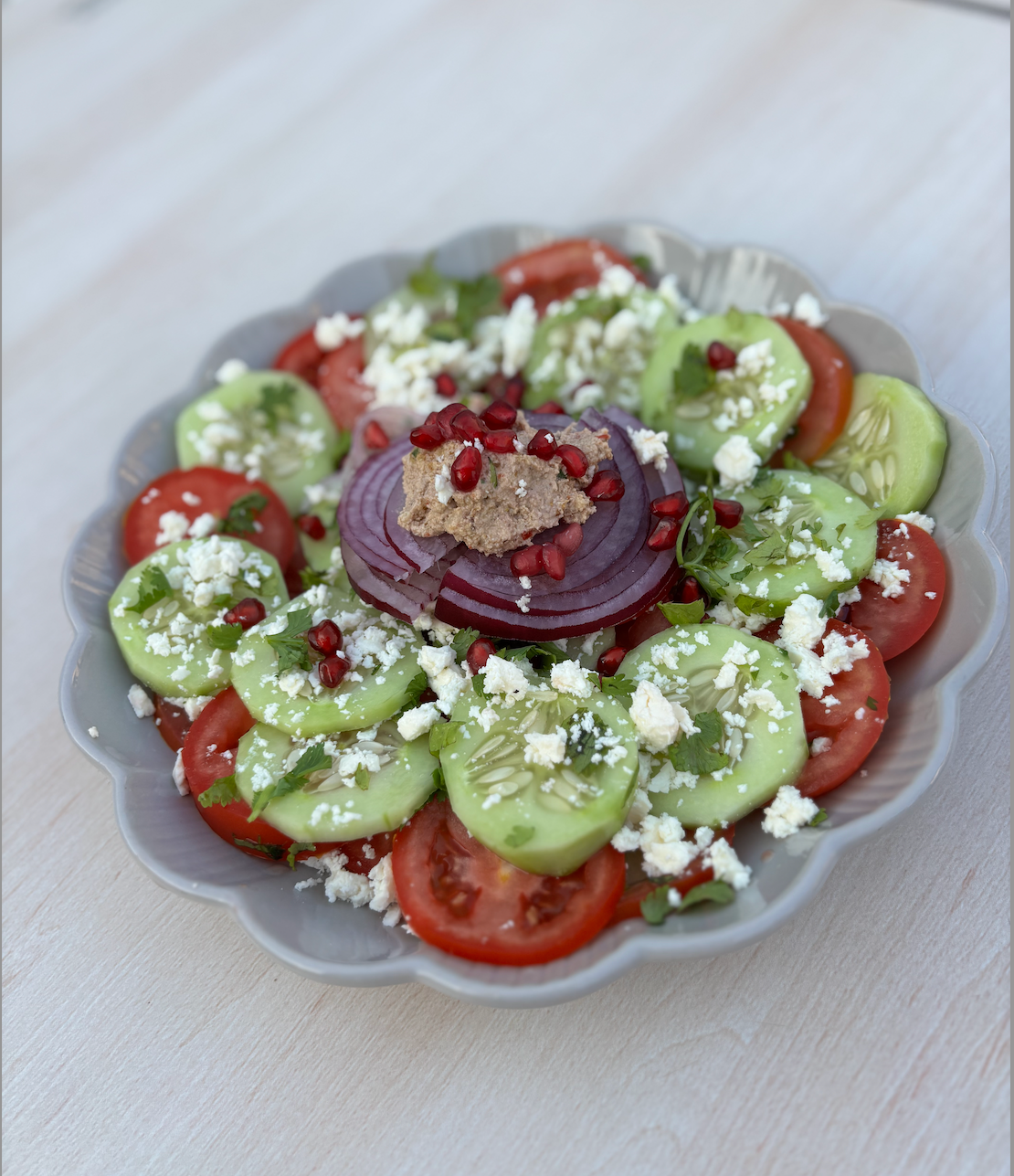 Cucumber, red onion, tomatoes, cilantro, walnuts, crumbly Georgian cheese. The perfect side to share.